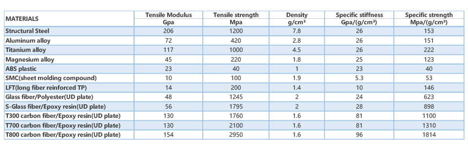 In industrial manufacturing, to achieve weight reduction material replacement order is: ordinary steel → hot-formed steel → aluminum alloy → magnesium alloy → carbon fiber, the weight of each material is descending, but the specific strength does not weaken. In terms of the current exploration of materials, the effect of using carbon fiber to achieve lightweight in the industrial field is the most obvious. In addition, there is a lot of room for the development of carbon fiber reinforced material system, and it is possible to design various kinds of materials with different performances. For the comparison of the mechanical properties of carbon fiber and other lightweight materials, it can be seen that the tensile strength and specific strength of carbon fiber or its composites perform much better than all other materials. ( Fig.: Comparison of mechanical properties of carbon fiber composites and other commonly used materials)